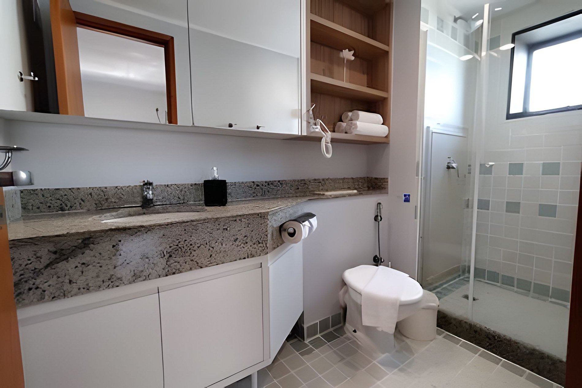 O quarto é equipado com cama de casal, sofá cama, micro-ondas, frigobar, TV, ferro de passar roupa, roupa de cama e banho, limpeza diária. Acomoda até 4 adultos. Estacionamento grátis com manobrista. Recepção 24 horas. Café da manhã não incluso.