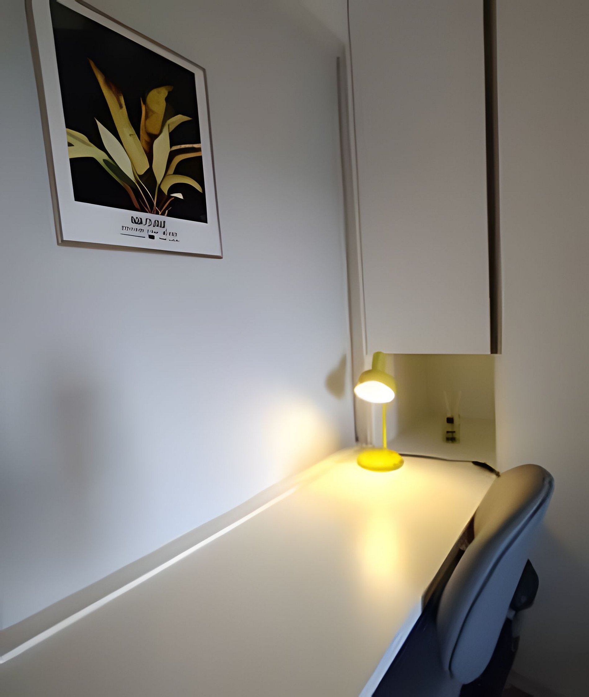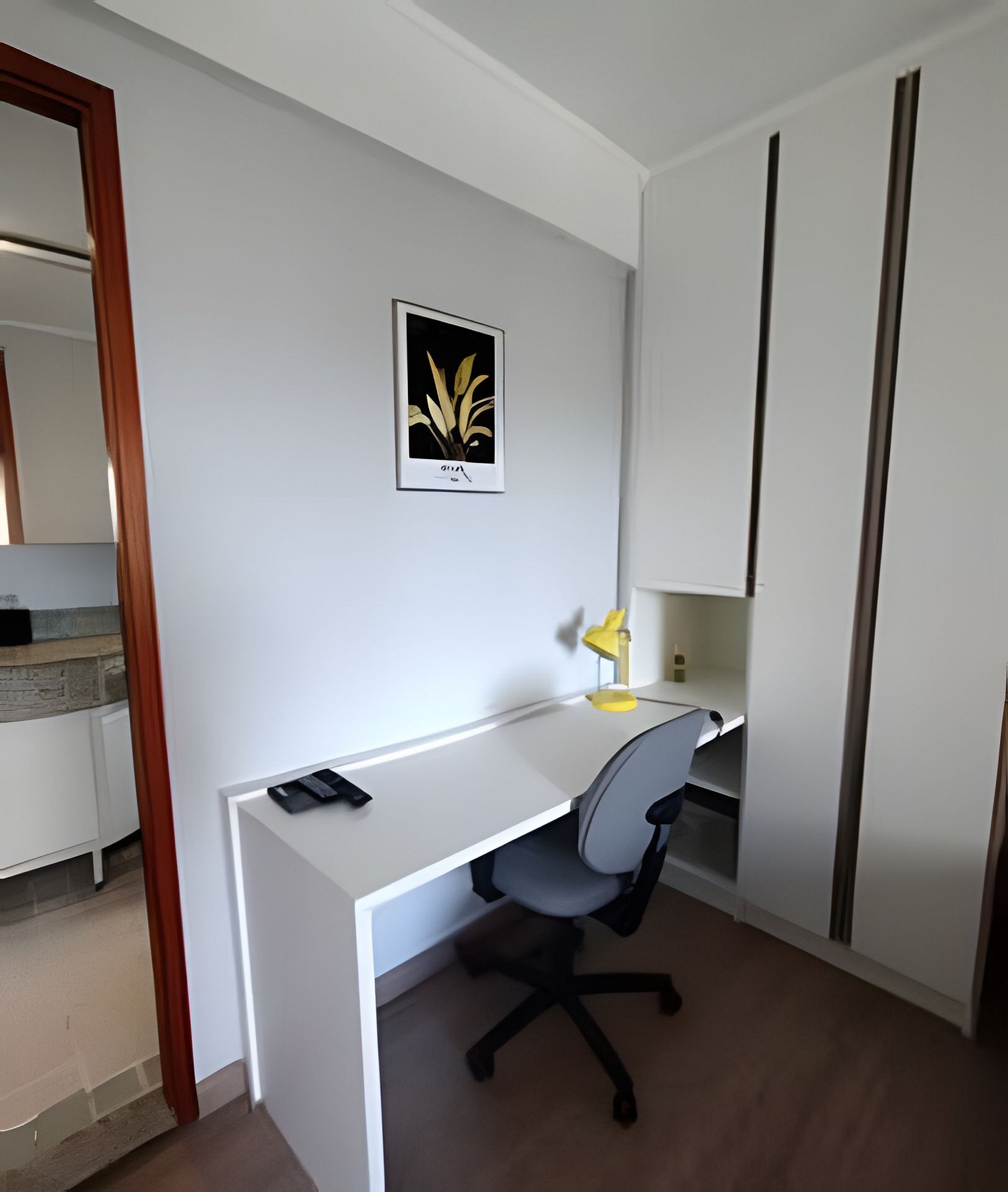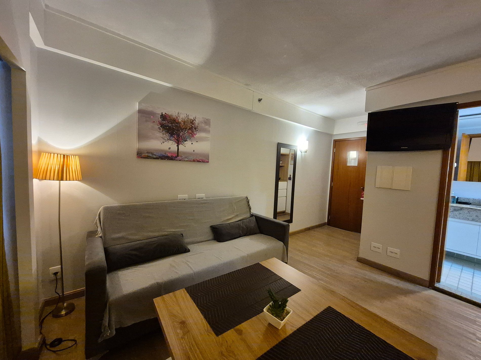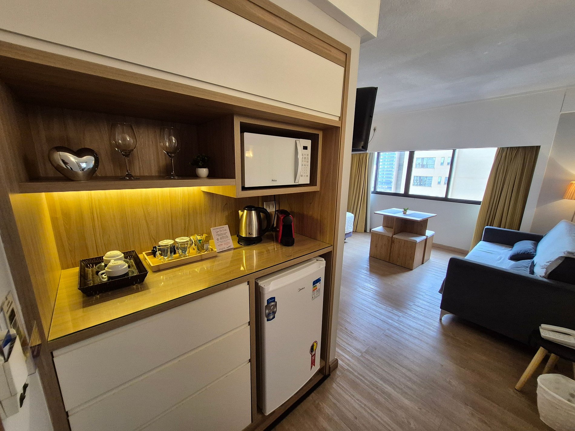 Equipado com frigobar, micro-ondas, chaleira elétrica, cafeteira Nespresso, ferro e tábua para passar roupa, cofre, roupa de cama e banho, mesa para trabalho, mesa para refeição e sofá cama.