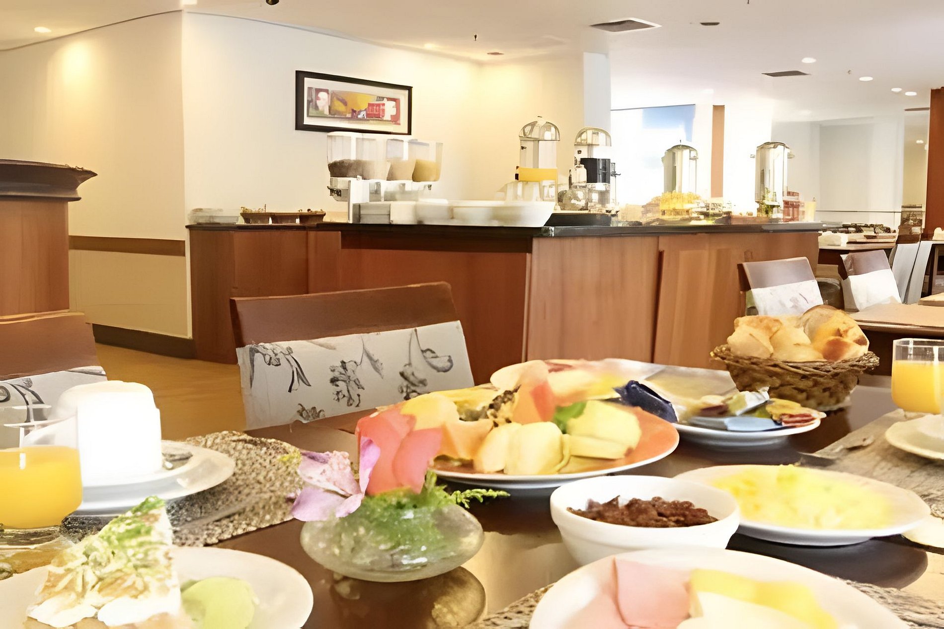 Hotel possui recepção 24 horas com vending machine (máquinas com alimentos, bebidas e produtos de higiene) estacionamento grátis, restaurante, academia.