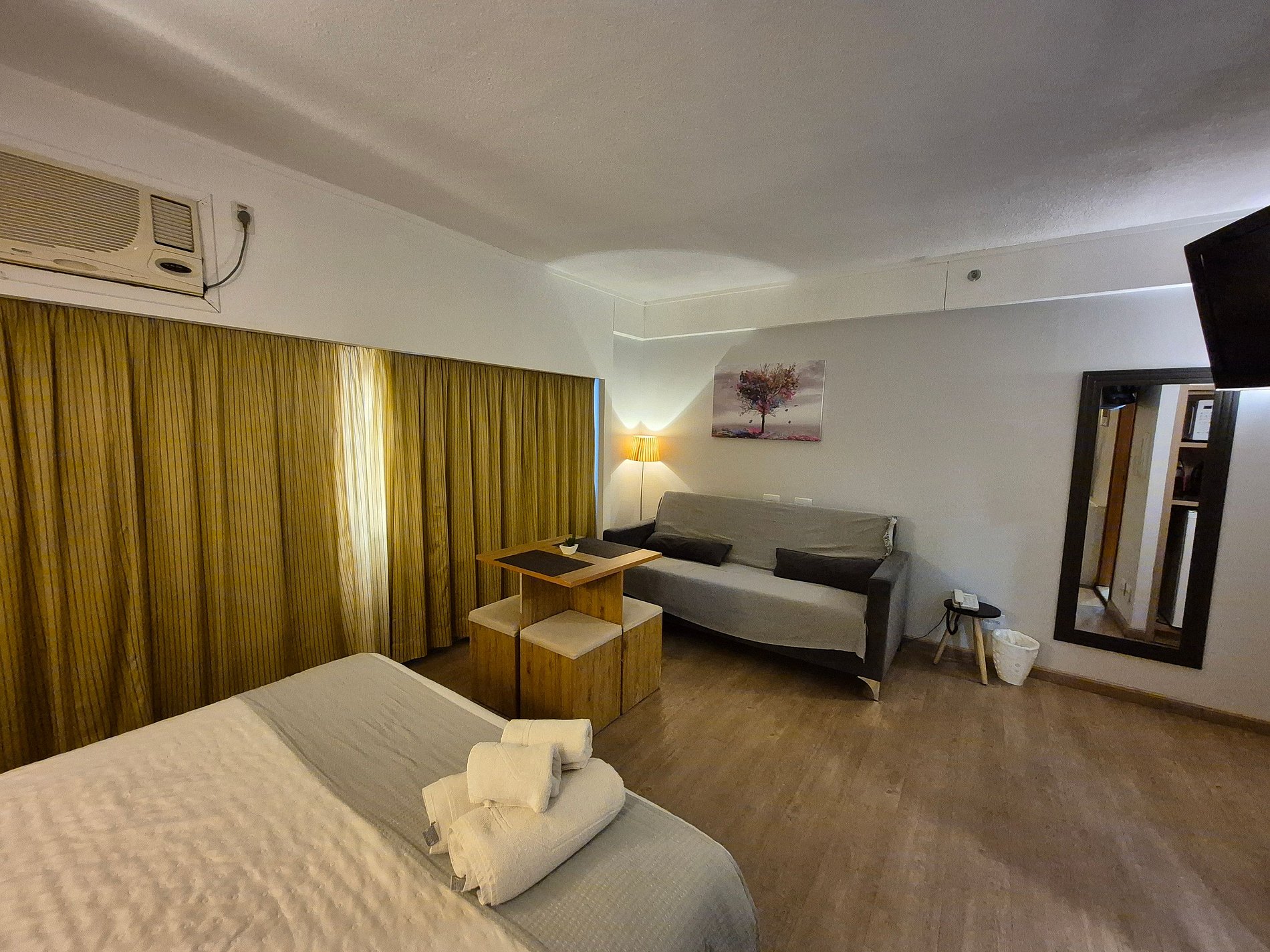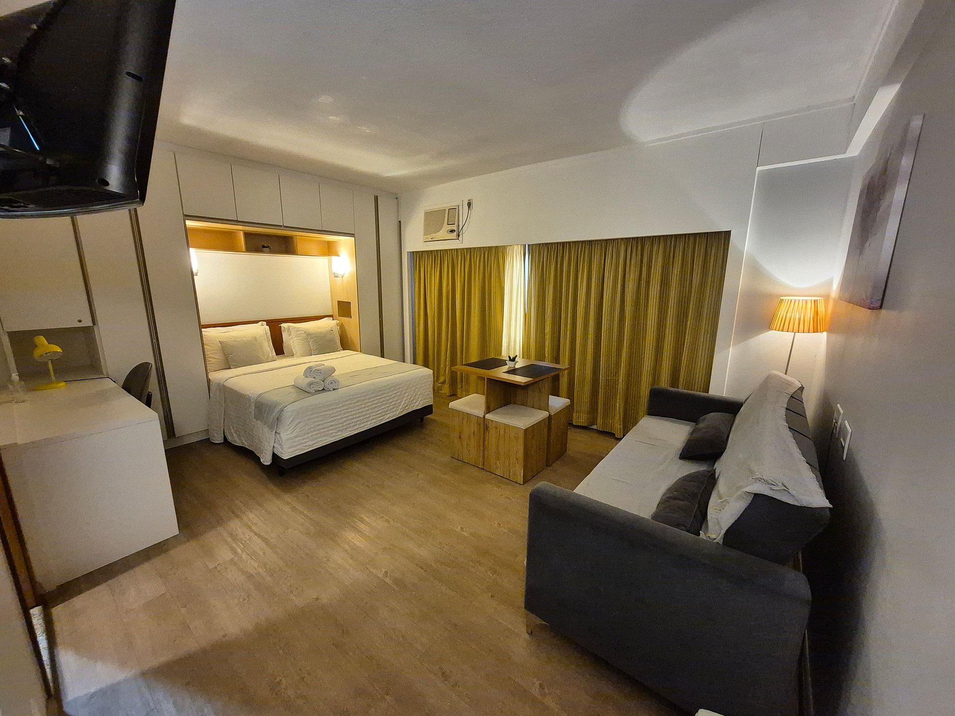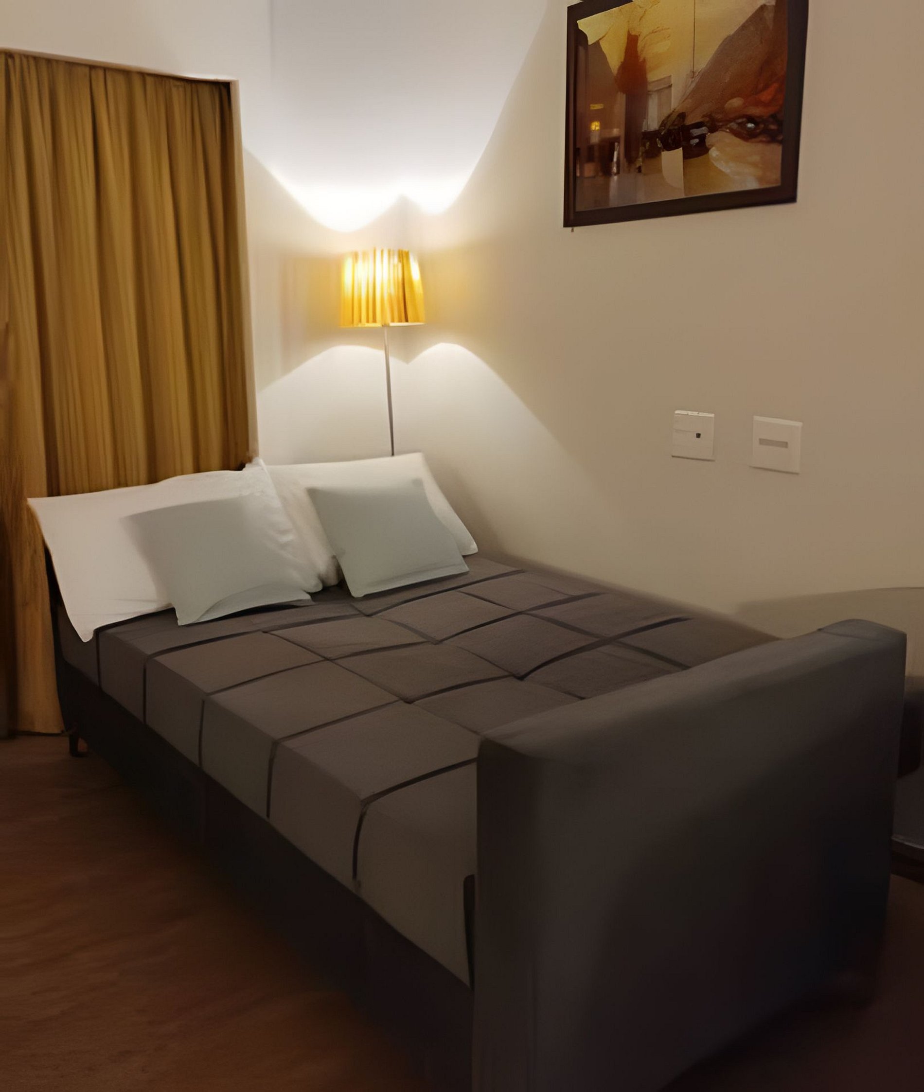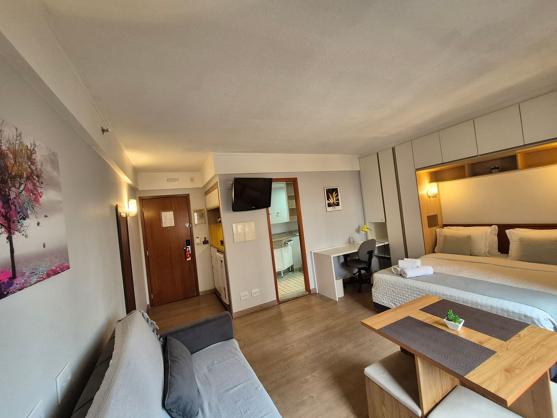O quarto é equipado com cama de casal, sofá cama, micro-ondas, frigobar, TV, ferro de passar roupa, roupa de cama e banho, limpeza diária. Acomoda até 4 adultos. Estacionamento grátis com manobrista. Recepção 24 horas. Café da manhã não incluso.