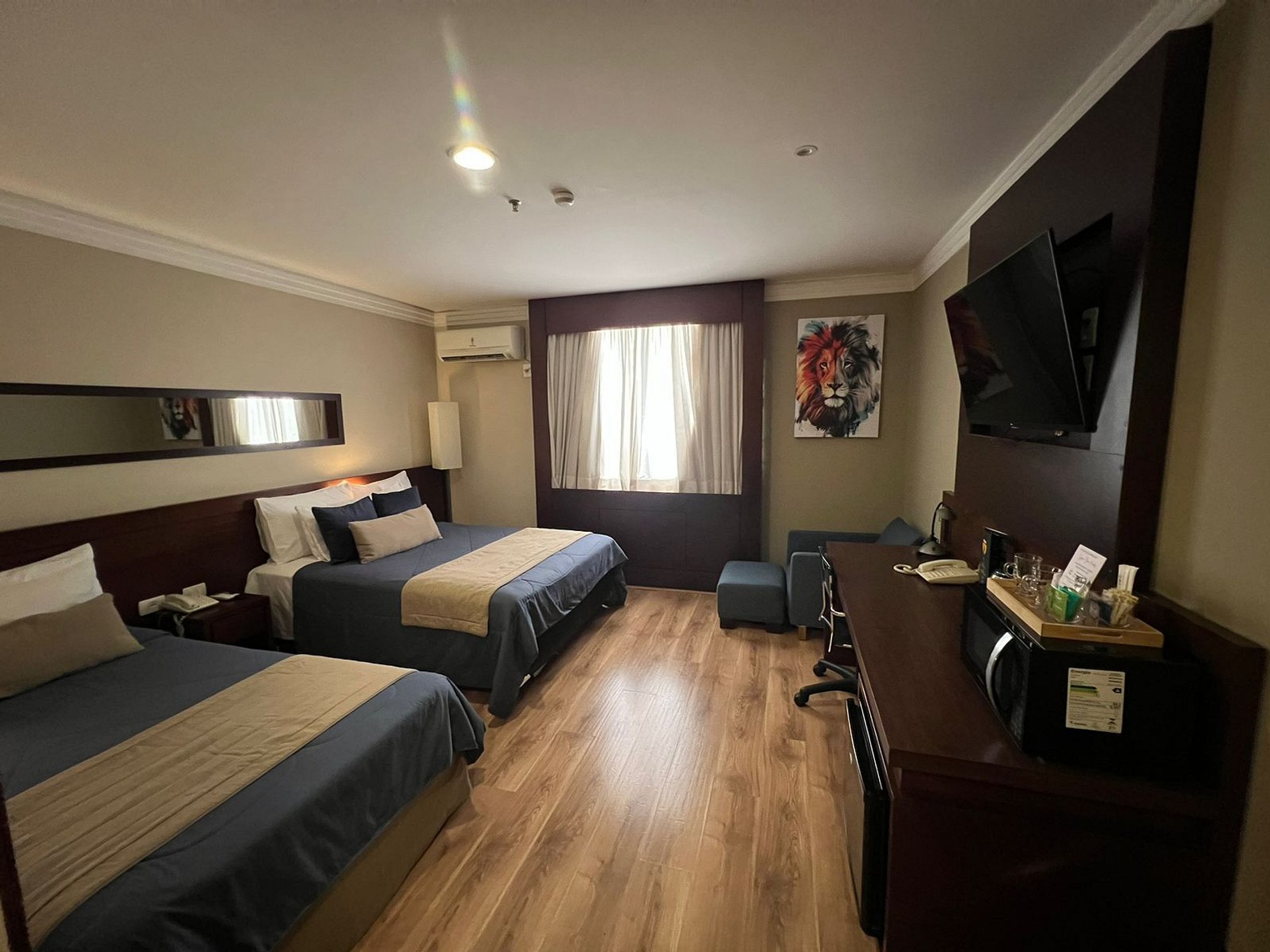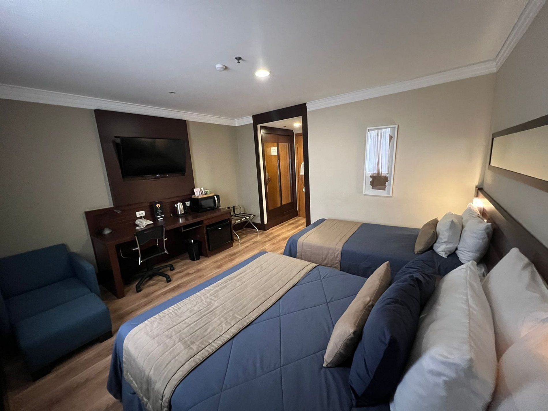 Acomoda 3 pessoas (1 cama de casal padrão e 1 cama de solteiro), ar-condicionado, TV SMART, microondas, chaleira elétrica, frigobar, prato, copo e talher, produtos de higiene pessoal, secador de cabelo, ferro de passar roupa, roupa de cama e toalhas. Próximo ao Aeroporto de Congonhas.