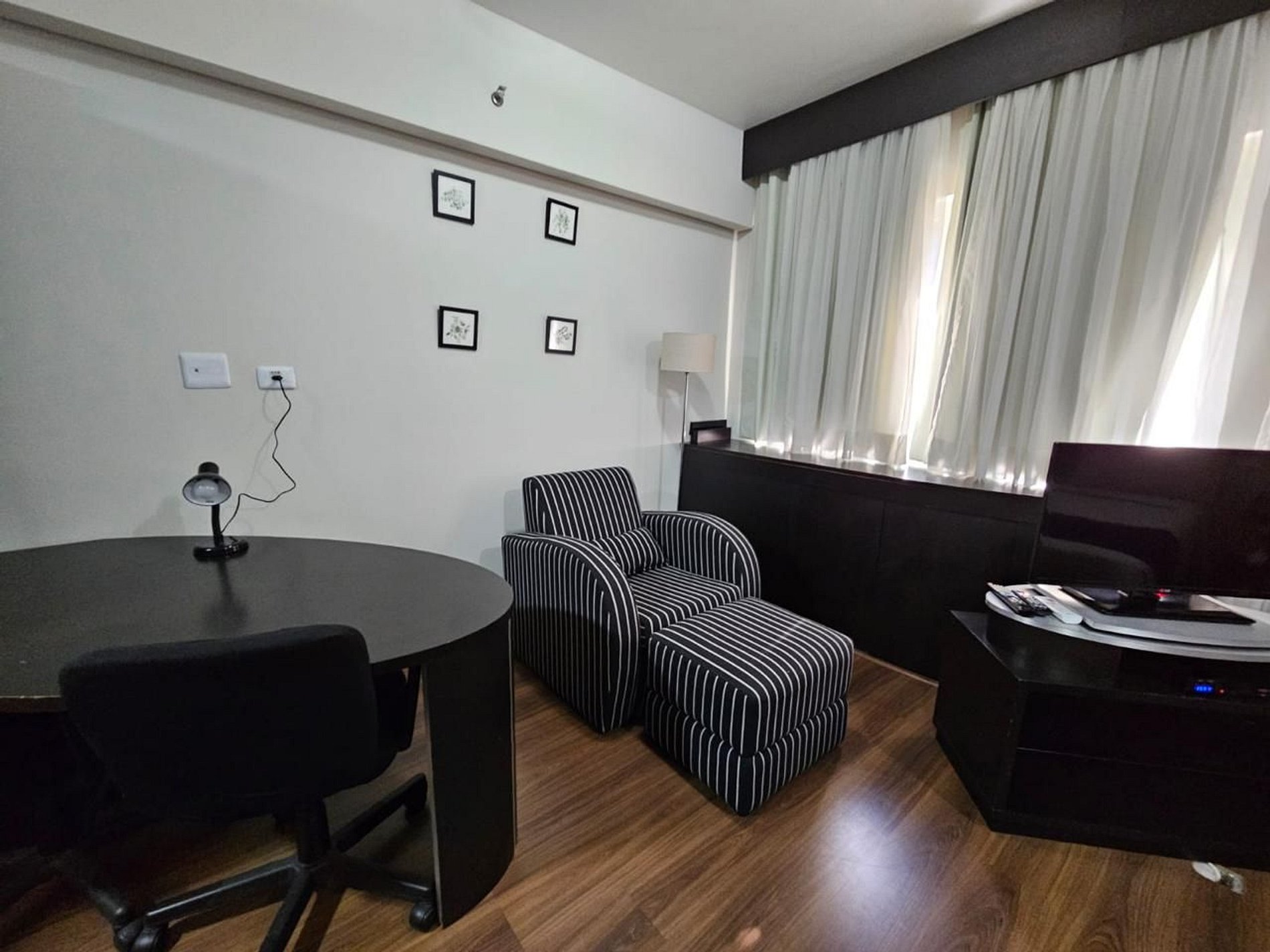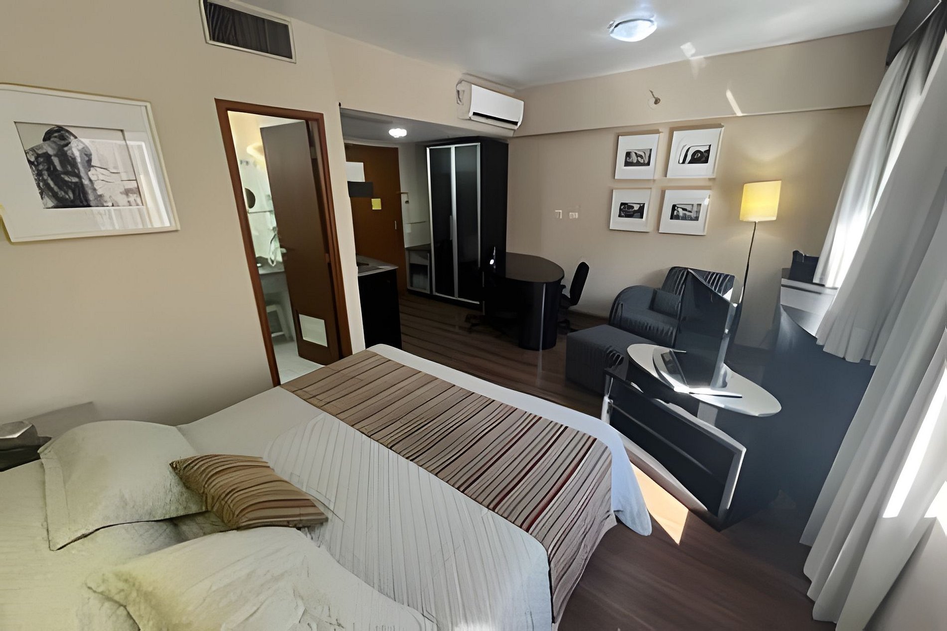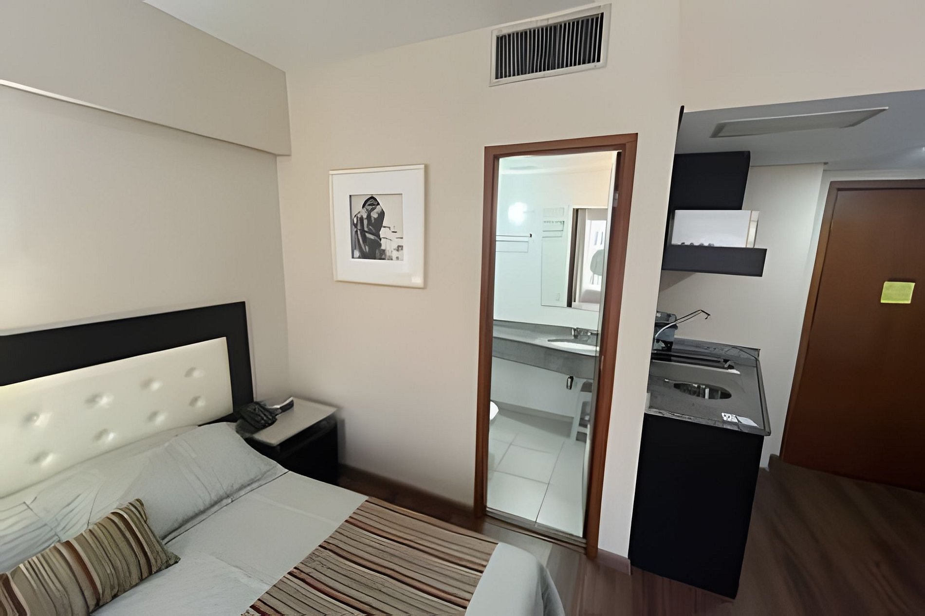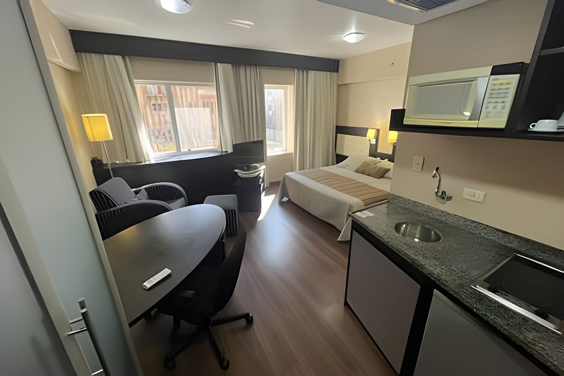 Quarto equipado com cama king, roupas de cama e banho, cozinha completa, TV, ar condicionado, internet e estacionamento gratuito. Há serviço de limpeza diário incluso.
