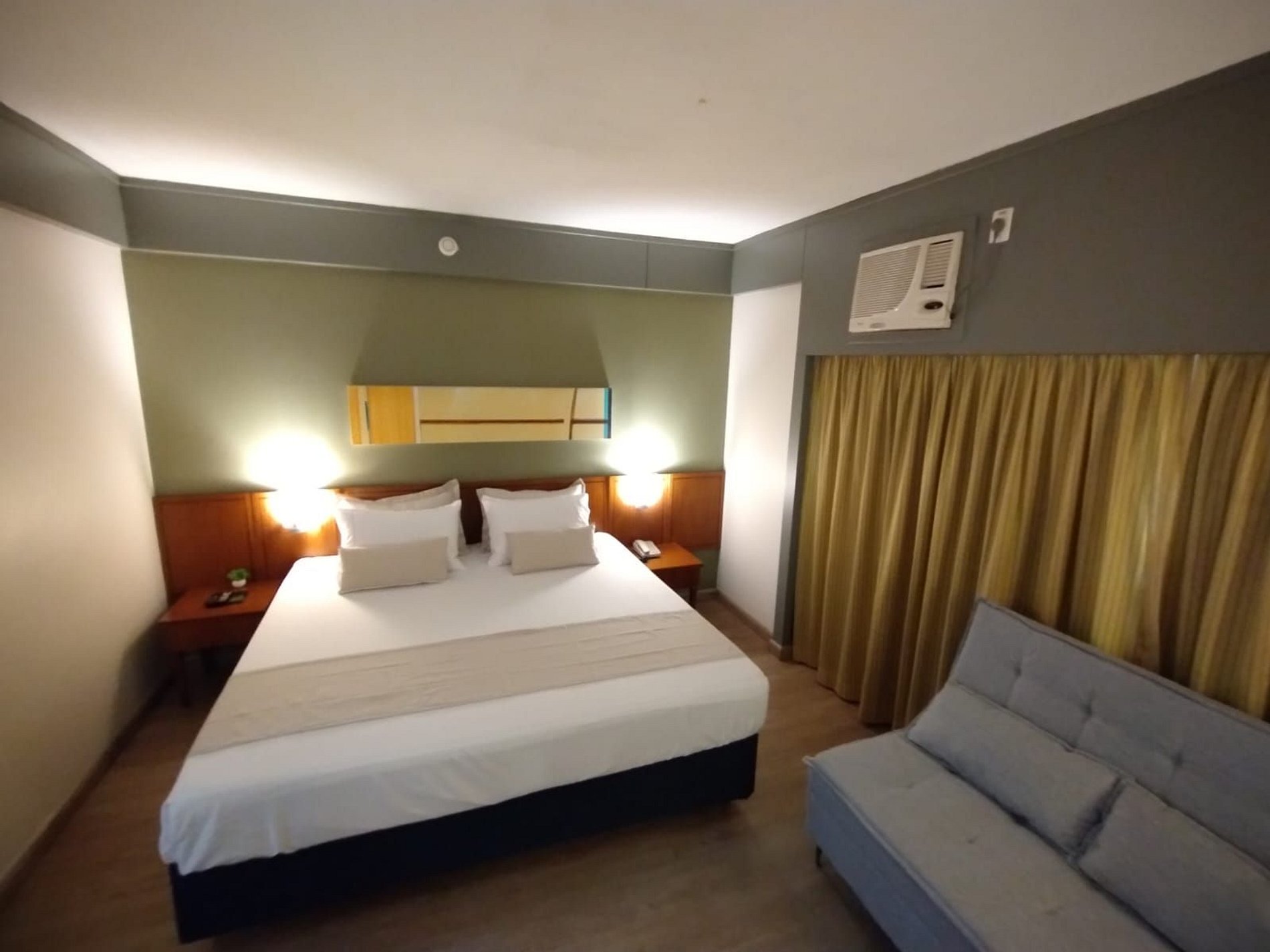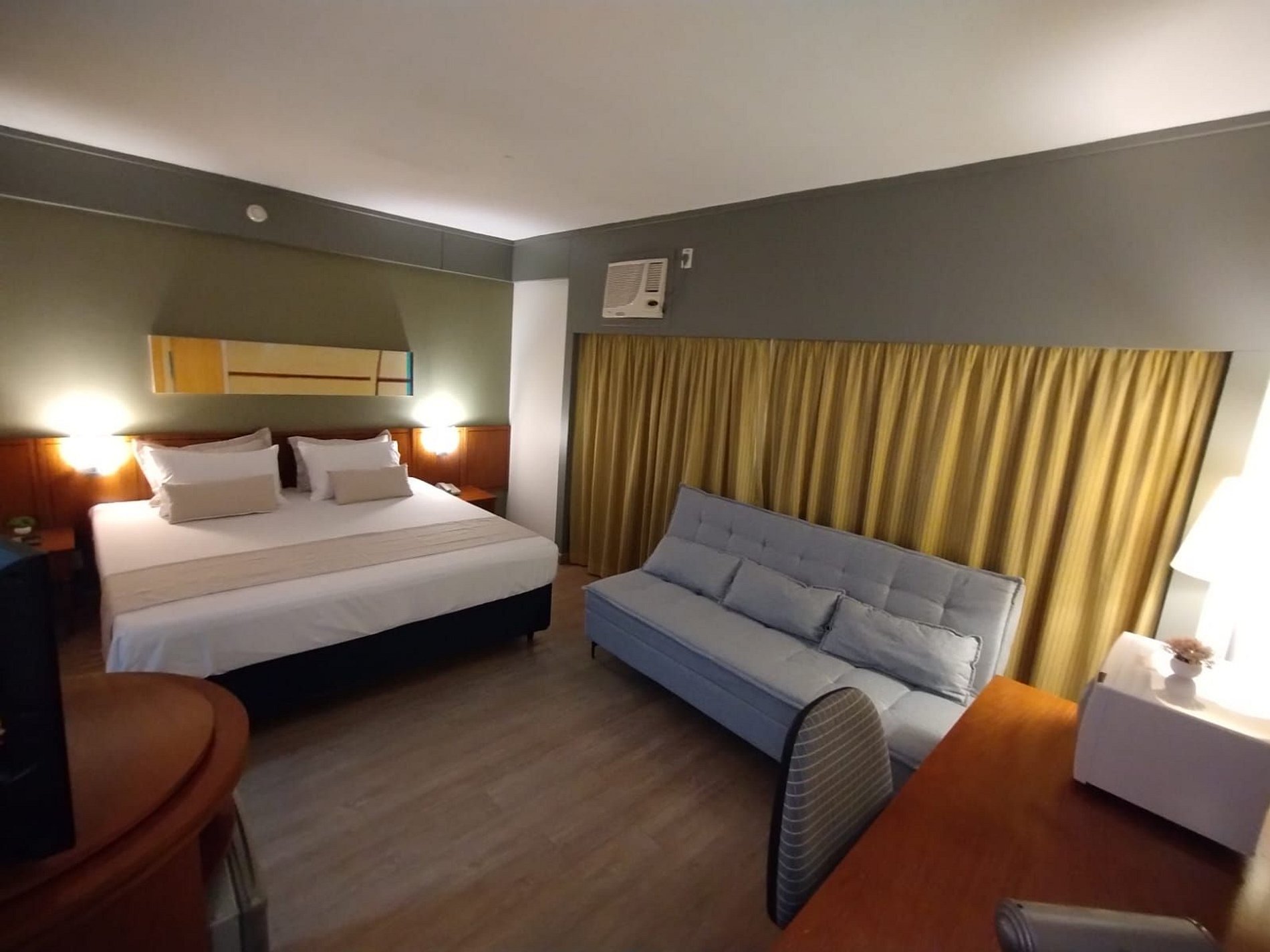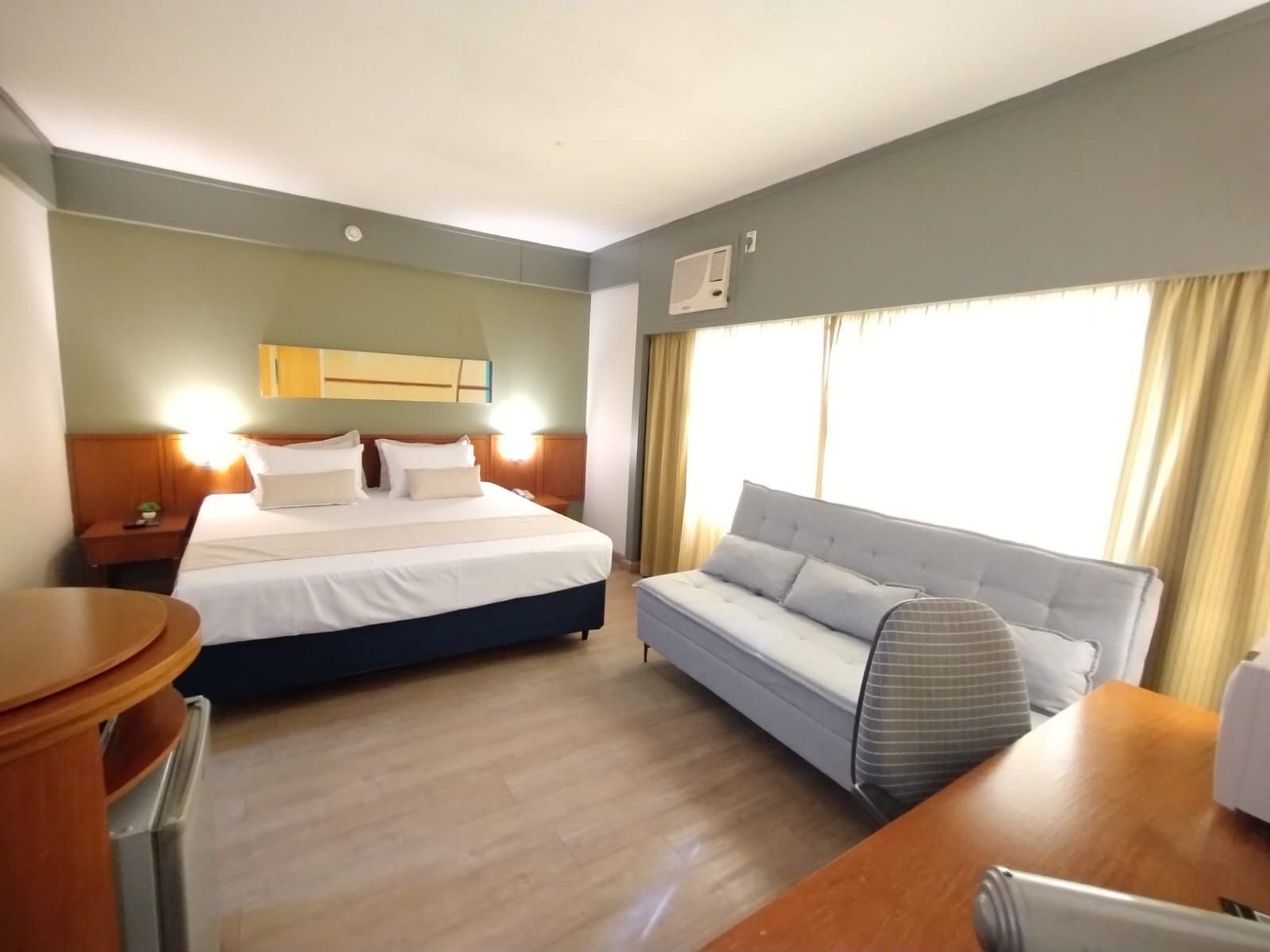 O quarto é equipado com cama de casal super King, sofá cama, micro-ondas, frigobar, TV, ferro de passar roupa, roupa de cama e banho, limpeza diária. Acomoda até 4 adultos. Estacionamento grátis com manobrista. Recepção 24 horas. Café da manhã não incluso.